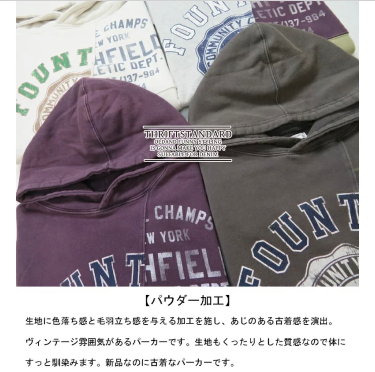THRIFT SHOPとは古着屋さんの事で、数年着た後でも古着屋さんで販売出来るクオリティと古着にありそうな雰囲気を作るという2つの意味を込め、